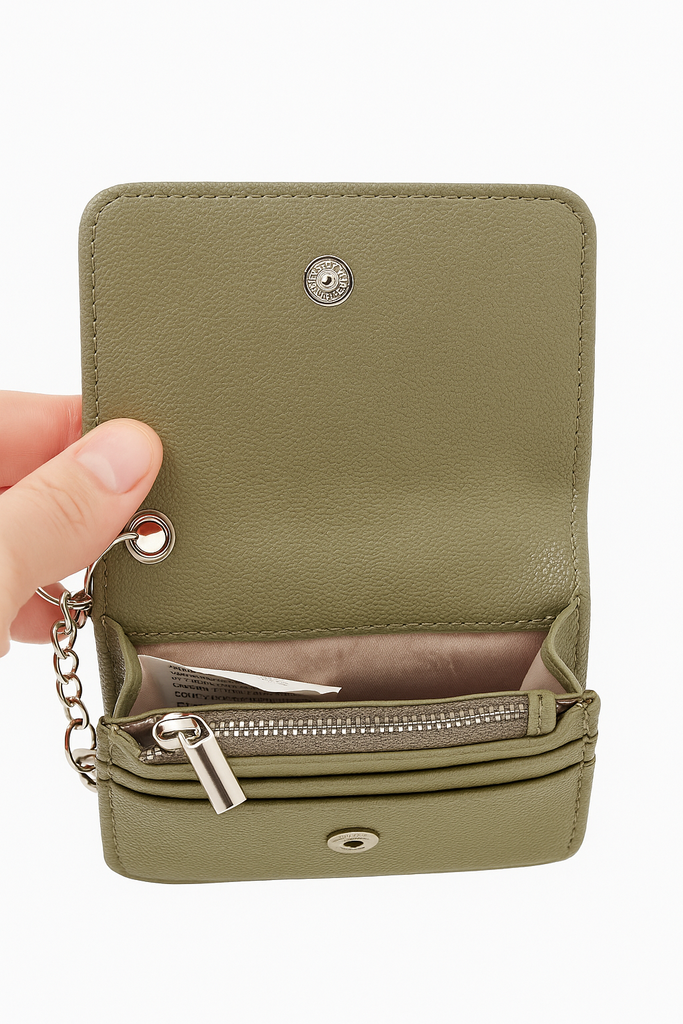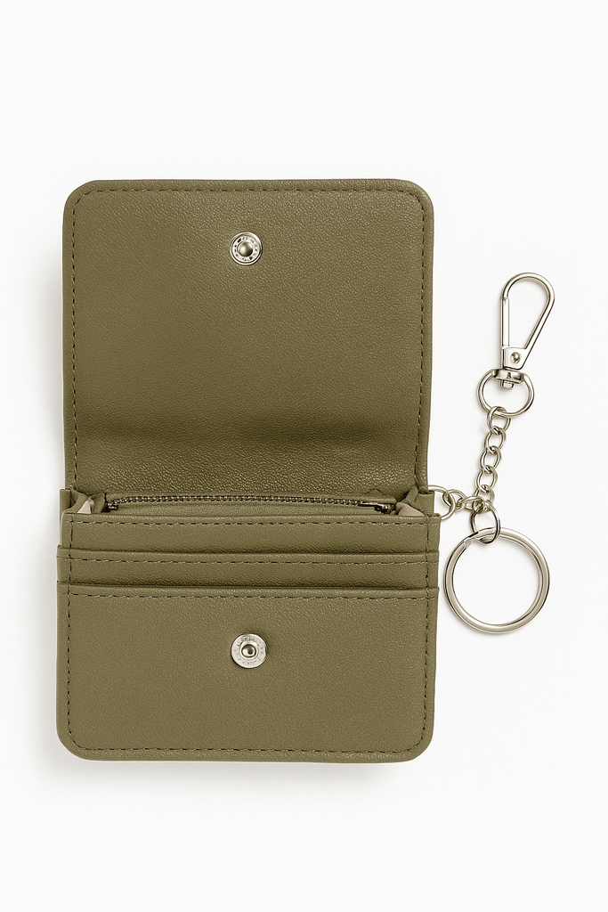 Cuenta con compartimentos para tarjetas, cierre seguro con broche a presión y argolla metálica para usar como llavero o colgarla en tu cartera. Perfecta para llevar lo esencial con estilo.